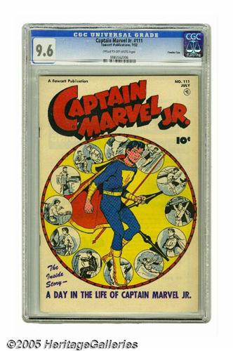 <B>Captain Marvel Jr. #111 Crowley Copy pedigree (Fawcett, 1952) CGC NM+ 9.6 Cream to off-white pages.</B></I> By 1952, the superhero craze was petering out, and the last few issues of the hero titles tend to be harder to find. This late issue (the series ended with #119) is a prime example. We've got a pedigree specimen here that's tied for the highest grade that CGC has assigned to date. Overstreet 2005 NM- 9.2 value = $190. CGC census 6/05: 2 in 9.6, none higher.