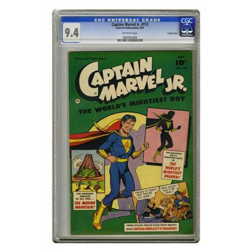 <B>Captain Marvel Jr. #113 Crowley Copy pedigree (Fawcett, 1952) CGC NM 9.4 Off-white pages.</B></I> The young Captain gives us a preview of what's in store on this multi-panel cover. The book is flat, sharply cut, and loaded with glossy cover color. This is another excellent example from the collection of former Fawcett editor Wendell Crowley. It's the highest CGC-graded copy to date. Overstreet 2005 NM- 9.2 value = $190. CGC census 11/05: 1 in 9.4, none higher.