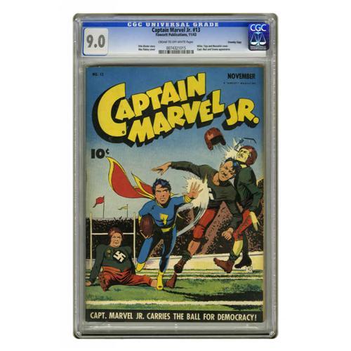 <B>Captain Marvel Jr. #13 Crowley Copy pedigree (Fawcett, 1943) CGC VF/NM 9.0 Cream to off-white pages.</B></I> Here's a novel idea -- let warring nations play it out through a game of football! Then make sure Captain Marvel Jr. is on your team! This classic cover by Mac Raboy features Hitler, Tojo, and Mussolini on the gridiron. Overstreet 2005 VF/NM 9.0 value = $666; NM- 9.2 value = $900. CGC census 11/05: 1 in 9.0, 1 higher.