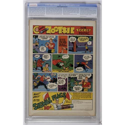 Captain Nazi makes a menacing appearance in this issue that bears a Mac Raboy cover and art. Art Helfant also contributes interior art. Has a "Checking Copy" stamp on the cover. Overstreet 2006 NM- 9.2 value = $940. CGC census 12/06: 1 in 9.2, none higher.<BR><BR><b>Shipping:</b> Slabbed Comic (<a target="_blank" href="http://www.heritageauctions.com/common/shipping.php">view shipping information</a>)