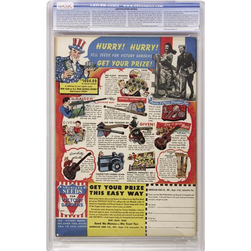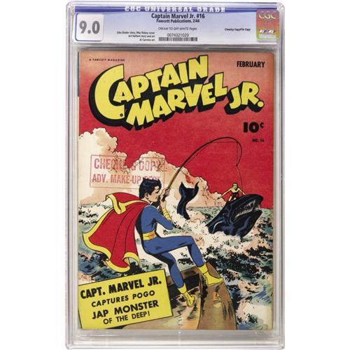 <B>Captain Marvel Jr. #16 Crowley Copy/File Copy (Fawcett, 1944) CGC VF/NM 9.0 Cream to off-white pages.</B></I> Another great Mac Raboy cover can be found here, along with a crossover featuring Captain Marvel and the evil Dr. Sivana. This is one of the two copies tied for the CGC's highest grade to date, as well as the first we've ever offered. The cover bears a "checking copy" stamp. Overstreet 2006 VF/NM 9.0 value = $566; NM- 9.2 value = $775. CGC census 10/06: 2 in 9.0, none higher.<BR><BR><b>Shipping:</b> Slabbed Comic (<a target="_blank" href="http://www.heritageauctions.com/common/shipping.php">view shipping information</a>)