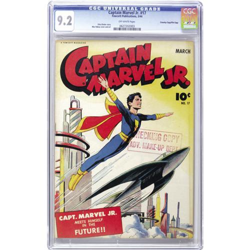 <B>Captain Marvel Jr. #17 Crowley Copy/File Copy (Fawcett, 1944) CGC NM- 9.2 Off-white pages.</B></I> The great Mac Raboy provided both this issue's futuristic cityscape cover as well as the interior art. This copy bears a "checking copy" stamp on the cover. Overstreet 2006 NM- 9.2 value = $775. CGC census 10/06: 1 in 9.2, 1 higher.<BR><BR><b>Shipping:</b> Slabbed Comic (<a target="_blank" href="http://www.heritageauctions.com/common/shipping.php">view shipping information</a>)