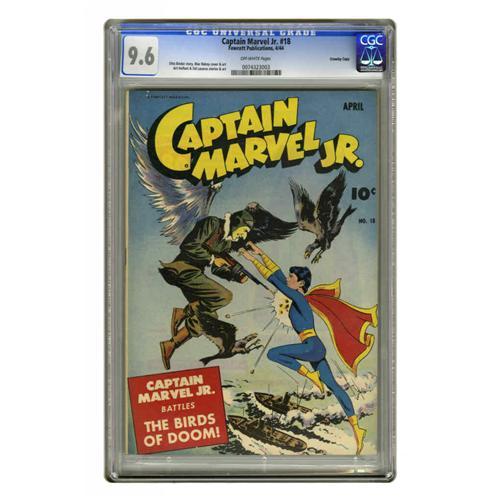 <B>Captain Marvel Jr. #18 Crowley Copy pedigree (Fawcett, 1944) CGC NM+ 9.6 Off-white pages.</B></I> The "Birds of Doom" menace Captain Marvel Jr. on this World War II cover by Mac Raboy. This near-perfect pedigreed copy is unsurpassed in the current CGC census report for issue #18. Overstreet 2005 NM- 9.2 value = $740. CGC census 11/05: 1 in 9.6, none higher.