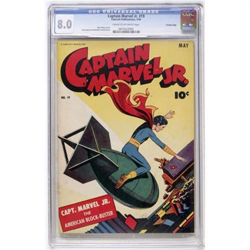 <B>Captain Marvel Jr. #19 Crowley Copy pedigree (Fawcett, 1944) CGC VF 8.0 Cream to off-white pages.</B></I> One of the nicer copies around of this issue, which features a sensational cover by Mac Raboy, plus Captain Nazi and Captain Nippon appearances inside. Overstreet 2007 VF 8.0 value = $356. CGC census 1/08: 3 in 8.0, 4 higher.<BR><BR><b>Shipping:</b> Comics - Slabbed (certified) (<a target="_blank" href="http://www.heritageauctions.com/common/shipping.php">view shipping information</a>)