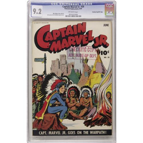 <B>Captain Marvel Jr. #20 Crowley Copy/File Copy (Fawcett, 1944) CGC NM- 9.2 Off-white pages.</B></I> This great file copy features an unusual Mac Raboy cover and stories and interior art by Sid Lazarus and Art Helfant. Overstreet 2006 NM- 9.2 value = $775. CGC census 10/06: 2 in 9.2, none higher.<BR><BR><b>Shipping:</b> Slabbed Comic (<a target="_blank" href="http://www.heritageauctions.com/common/shipping.php">view shipping information</a>)