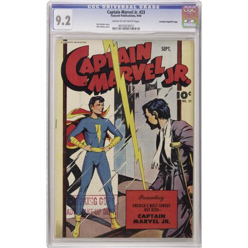 <B>Captain Marvel Jr. #23 Crowley Copy/File Copy (Fawcett, 1944) CGC NM- 9.2 Cream to off-white pages.</B></I> This pedigree issue features an Otto Binder story and Mac Raboy cover art. Overstreet 2006 NM- 9.2 value = $610. CGC census 9/06: 2 in 9.2, none higher.<BR><BR><b>Shipping:</b> Slabbed Comic (<a target="_blank" href="http://www.heritageauctions.com/common/shipping.php">view shipping information</a>)