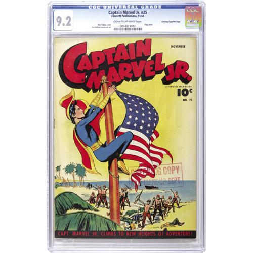 <B>Captain Marvel Jr. #25 Crowley Copy/File Copy (Fawcett, 1944) CGC NM- 9.2 Cream to off-white pages.</B></I> Junior rallies the troops on this great flag cover by Mac Raboy. This copy is tied with one other as the highest graded copy certified by CGC to date, and is also the first we've had the privilege to offer. It bears a "checking copy" stamp on the front cover. Overstreet 2006 NM- 9.2 value = $610. CGC census 10/06: 2 in 9.2, none higher.<BR><BR><b>Shipping:</b> Slabbed Comic (<a target="_blank" href="http://www.heritageauctions.com/common/shipping.php">view shipping information</a>)