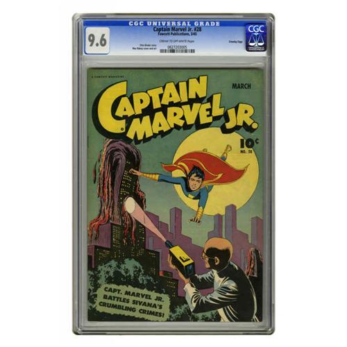 <B>Captain Marvel Jr. #28 Crowley Copy pedigree (Fawcett, 1945) CGC NM+ 9.6 Cream to off-white pages.</B></I> Dr. Sivana is using a strange ray that causes tall buildings to melt on this issue's Mac Raboy cover. It's interesting to see Raboy's more realistic version of Sivana, who is usually depicted in the more cartoonish style of C. C. Beck. This pedigreed copy is remarkably fresh-looking and well-centered. Overstreet 2005 NM- 9.2 value = $585. CGC census 11/05: 2 in 9.6, none higher.