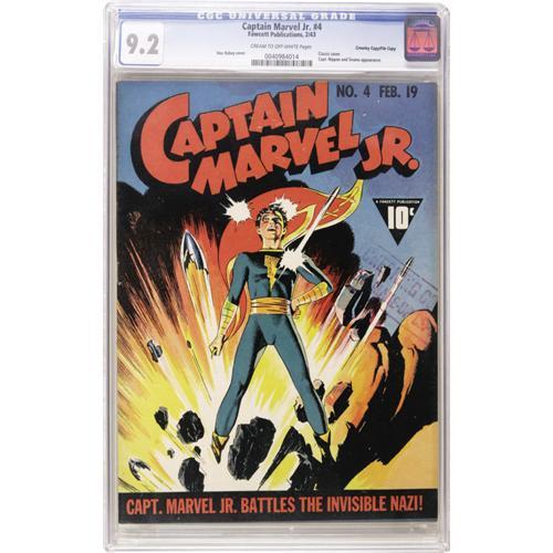 <B>Captain Marvel Jr. #4 Crowley Copy/File Copy (Fawcett, 1943) CGC NM- 9.2 Cream to off-white pages.</B></I> Captain Marvel Jr. strikes a dramatic pose on Mac Raboy's classic cover to this issue. The villainous Captain Nippon and Dr. Sivana appear inside. This copy is the highest certified by CGC to date, and bears a light "checking copy" stamp on the front cover. It's also the first we've ever had the privilege to offer. Overstreet 2006 NM- 9.2 value = $1,625. CGC census 10/06: 1 in 9.2, none higher.<BR><BR><b>Shipping:</b> Slabbed Comic (<a target="_blank" href="http://www.heritageauctions.com/common/shipping.php">view shipping information</a>)