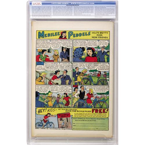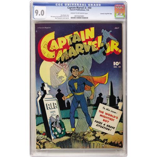 <B>Captain Marvel Jr. #40 Crowley Copy/File Copy (Fawcett, 1946) CGC VF/NM 9.0 Cream to off-white pages.</B></I> Bud Thompson cover and art. Sid Lazarus and Art Helfant art. Has a Checking Copy stamp on the cover. Overstreet 2006 VF/NM 9.0 value = $291; NM- 9.2 value = $385. CGC census 10/06: 2 in 9.0, 1 higher.<BR><BR><b>Shipping:</b> Slabbed Comic (<a target="_blank" href="http://www.heritageauctions.com/common/shipping.php">view shipping information</a>)