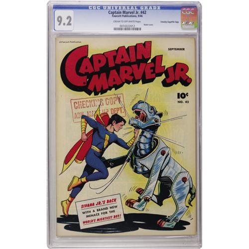 <B>Captain Marvel Jr. #42 Crowley Copy/File Copy (Fawcett, 1946) CGC NM- 9.2 Cream to off-white pages.</B></I> Robot cover. Checking Copy stamp on cover. Overstreet 2006 NM- 9.2 value = $300. CGC census 10/06: 1 in 9.2, 3 higher.<BR><BR><b>Shipping:</b> Slabbed Comic (<a target="_blank" href="http://www.heritageauctions.com/common/shipping.php">view shipping information</a>)