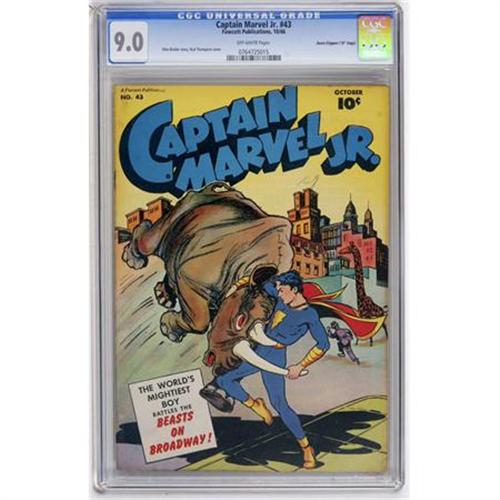 <B>Captain Marvel Jr. #43 Davis Crippen ("D" Copy) pedigree (Fawcett, 1946) CGC VF/NM 9.0 Off-white pages.</B></I> Bud Thompson cover. Overstreet 2007 VF/NM 9.0 value = $237; NM- 9.2 value = $320. CGC census 9/07: 1 in 9.0, 3 higher.<BR><BR><b>Shipping:</b> Comics - Slabbed (certified) (<a target="_blank" href="http://www.heritageauctions.com/common/shipping.php">view shipping information</a>)