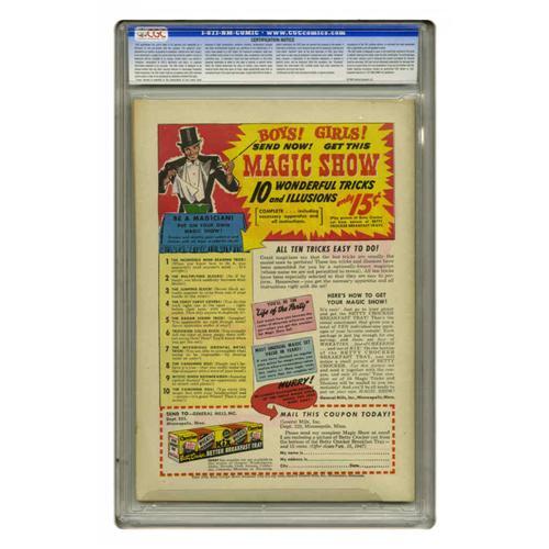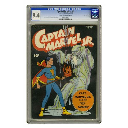 <B>Captain Marvel Jr. #45 Crowley Copy pedigree (Fawcett, 1946) CGC NM 9.4 Cream to off-white pages.</B></I> Mac Raboy wasn't the only one turning out great covers for this series -- check out this superb Bud Thomson effort, showing a colorful young Captain set against a pitch-black background! This striking copy originally came from the collection of former Fawcett editor Wendell Crowley. Overstreet 2005 NM- 9.2 value = $290. CGC census 11/05: 1 in 9.4, none higher.