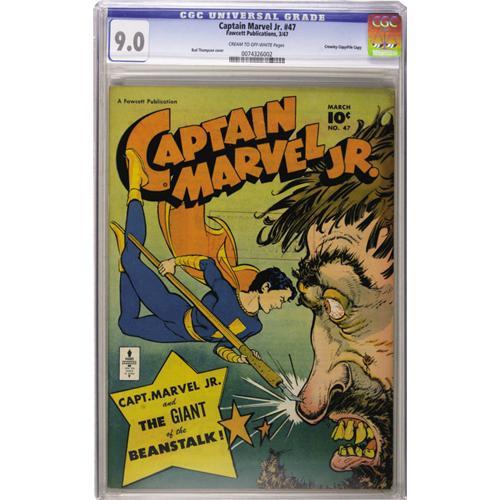 <B>Captain Marvel Jr. #47 Crowley Copy/File Copy (Fawcett, 1947) CGC VF/NM 9.0 Cream to off-white pages.</B></I> The giant on this Bud Thompson cover looks very Sam Kieth-like. It also bears a "Checking Copy" stamp. Overstreet 2006 VF/NM 9.0 value = $227; NM- 9.2 value = $300. CGC census 11/06: 2 in 9.0, 2 higher.<BR><BR><b>Shipping:</b> Slabbed Comic (<a target="_blank" href="http://www.heritageauctions.com/common/shipping.php">view shipping information</a>)