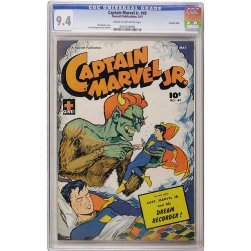 <B>Captain Marvel Jr. #49 Crowley Copy pedigree (Fawcett, 1947) CGC NM 9.4 Cream to off-white pages.</B></I> Bud Thompson cover and art. Overstreet 2006 NM- 9.2 value = $300. CGC census 10/06: 3 in 9.4, 1 higher.<BR><BR><b>Shipping:</b> Slabbed Comic (<a target="_blank" href="http://www.heritageauctions.com/common/shipping.php">view shipping information</a>)