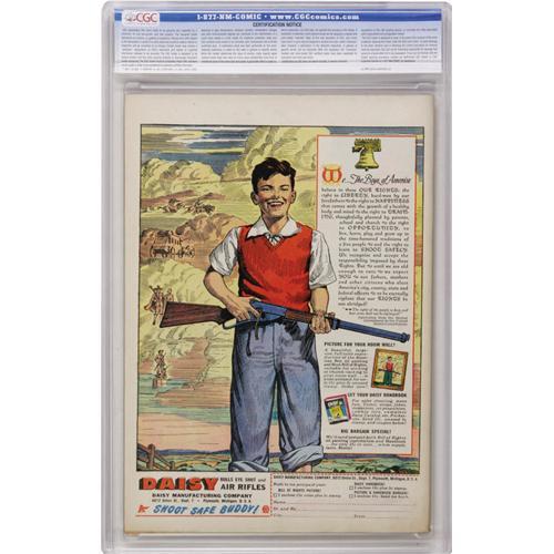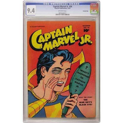 <B>Captain Marvel Jr. #56 Crowley Copy pedigree (Fawcett, 1947) CGC NM 9.4 Off-white pages.</B></I> "The Blue Boy's Black Eye" is the cover story on this pedigree book. Overstreet 2006 NM- 9.2 value = $300. CGC census 10/06: 1 in 9.4, none higher.<BR><BR><b>Shipping:</b> Slabbed Comic (<a target="_blank" href="http://www.heritageauctions.com/common/shipping.php">view shipping information</a>)