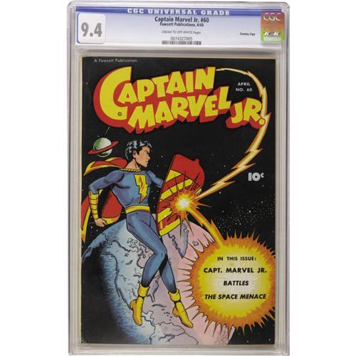 <B>Captain Marvel Jr. #60 Crowley Copy pedigree (Fawcett, 1948) CGC NM 9.4 Cream to off-white pages.</B></I> The highest-graded of only two copies in CGC's census, and the first we've ever had the chance to offer. Overstreet 2006 NM- 9.2 value = $300. CGC census 12/06: 1 in 9.4, none higher.<BR><BR><b>Shipping:</b> Slabbed Comic (<a target="_blank" href="http://www.heritageauctions.com/common/shipping.php">view shipping information</a>)