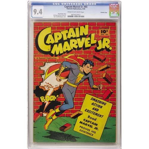 <B>Captain Marvel Jr. #65 Crowley Copy pedigree (Fawcett, 1948) CGC NM 9.4 Cream to off-white pages.</B></I> Kurt Schaffenberger cover. Bill Ward and Joe Certa art. Overstreet 2006 NM- 9.2 value = $300. CGC census 9/06: 1 in 9.4, none higher.<BR><BR><b>Shipping:</b> Slabbed Comic (<a target="_blank" href="http://www.heritageauctions.com/common/shipping.php">view shipping information</a>)