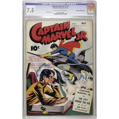 <B>Captain Marvel Jr. #7 Crowley Copy/File Copy (Fawcett, 1943) CGC VF- 7.5 Cream to off-white pages.</B></I> This is the very first time we have offered this issue, which suggests it doesn't come around that often. And it doesn't come much better, as CGC's census shows just two copies having graded better at VF+ 8.5. The striking Mac Raboy cover is the main attraction. Overstreet 2006 VF 8.0 value = $500. CGC census 10/06: 2 in 7.5, 2 higher.<BR><BR><b>Shipping:</b> Slabbed Comic (<a target="_blank" href="http://www.heritageauctions.com/common/shipping.php">view shipping information</a>)