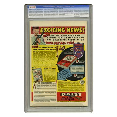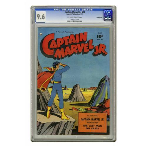<B>Captain Marvel Jr. #97 Crowley Copy pedigree (Fawcett, 1951) CGC NM+ 9.6 Off-white to white pages.</B></I> Captain Marvel Jr. finds himself all alone as he searches for "The Last Man On Earth." Hey, where did everyone go? Don't miss submitting a bid on this beautiful specimen, which is the highest CGC-graded copy to date. Overstreet 2005 NM- 9.2 value = $210. CGC census 11/05: 1 in 9.6, none higher.
