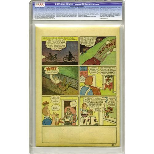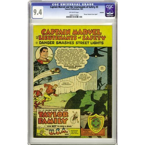 <B>Captain Marvel and the Lieutenants of Safety #3 Rockford pedigree (Fawcett, 1951) CGC NM 9.4 Off-white pages.</B></I> This great promo comic features the story "Danger Smashes Street Lights", along with the Taylor Family in "How Not to Ride a Bike" as a backup. It's another fantastic specimen from the Rockford pedigree, which also happens to be the highest grade awarded by CGC for this issue. Overstreet 2006 NM- 9.2 value = $1,250. CGC census 5/06: 1 in 9.4, none higher. <BR><BR><B>Important notice:</B> Heritage usually auctions material at the rate of 200-250 lots per hour. On some occasions eBay Live bid software or the Internet may not be able to keep up with the pace of the auction. We recommend placing a realistic absentee bid now as insurance to avoid disappointment. Occasionally the auctioneer may eliminate or reject an eBay Live bid, and the auctioneer may also reopen a lot after the close of the eBay live bidding (usually because we missed an audience bid), and may reject your bid even if it shows you as the winning bidder. By bidding via eBay Live, you agree that Heritage may award the lot to another bidder at its sole discretion under the circumstances described above or any other reasonable circumstances. Since eBay bids are not shown to us until we open the lot on the floor, we treat those bids just like floor bids. In most cases the floor responds before the eBay bid is presented to us, due to Internet lag time, so for consistency we have made it a policy that floor bids are always considered first over tie eBay live bids. Also please note that all Heritage lots purchased through eBay Live carry a 22.5% Buyer's Premium. Please make sure you read the Terms and Conditions before you bid. This lot is being auctioned in conjunction with a live floor auction by Heritage Auction Galleries. All final auction and invoice information will be supplied by Heritage Auction Galleries, and all other information should be considered preliminary. Lot:41001 <BR><BR><B>Winning Notification and Billing:</B> After the FINAL session in this auction is complete, Heritage will send e-mail and snail mail invoices. This process normally takes several days. All final auction and invoice information will be supplied by Heritage Auction Galleries, and all other information should be considered preliminary. <BR><BR>This auction will be conducted on a live auction floor and over the Internet through eBay Live. If you choose to place an absentee bid, please take a moment to <font color='#0000ff'><u><a href='http://pages.ebay.com/liveauctions/help/before/laabsentee.html'>learn how eBay Live absentee bidding works</a></u></font><font color='#000000'>