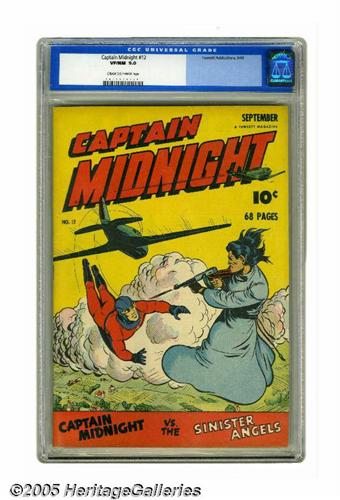 <B>Captain Midnight #12 (Fawcett, 1943) CGC VF/NM 9.0 Cream to off-white pages.</B></I> This is one of the nicest copies you'll find of this mag featuring that star of the radio waves, Captain Midnight. Overstreet 2005 VF/NM 9.0 value = $538; NM- 9.2 value = $725. CGC census 5/05: 3 in 9.0, 1 higher.