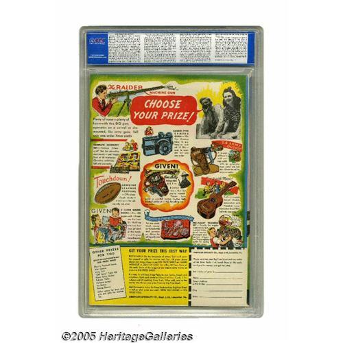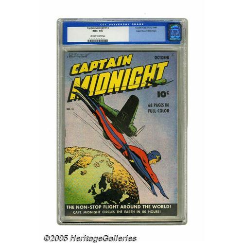 <B>Captain Midnight #13 Mile High pedigree (Fawcett, 1943) CGC NM+ 9.6 Off-white to white pages.</B></I> This Mile High happens to be the copy pictured in Gerber's " "<B>Photo-Journal</B></I>, but the pic in Gerber's book hardly does it justice -- have a look at it in all its glory here in our catalog, or better yet, put in an aggressive bid and enjoy it in your own living room! Overstreet 2005 NM- 9.2 value = $725. CGC census 9/05: 2 in 9.6, none higher. <BR><BR><B>Important notice:</B> Heritage usually auctions material at the rate of 200-250 lots per hour. On some occasions eBay Live bid software or the Internet may not be able to keep up with the pace of the auction. We recommend placing a realistic absentee bid now as insurance to avoid disappointment. Occasionally the auctioneer may eliminate or reject an eBay Live bid, and the auctioneer may also reopen a lot after the close of the eBay live bidding (usually because we missed an audience bid), and may reject your bid even if it shows you as the winning bidder. By bidding via eBay Live, you agree that Heritage may award the lot to another bidder at its sole discretion under the circumstances described above or any other reasonable circumstances. Since eBay bids are not shown to us until we open the lot on the floor, we treat those bids just like floor bids. In most cases the floor responds before the eBay bid is presented to us, due to Internet lag time, so for consistency we have made it a policy that floor bids are always considered first over tie eBay live bids. Also please note that all Heritage lots purchased through eBay Live carry a 20% Buyer's Premium. Please make sure you read the Terms and Conditions before you bid. This lot is being auctioned in conjunction with a live floor auction by Heritage Galleries & Auctioneers. All final auction and invoice information will be supplied by Heritage Galleries & Auctioneers, and all other information should be considered preliminary. Lot:2307 <BR><BR><B>Winnin