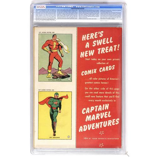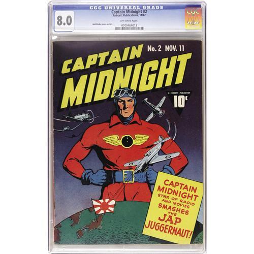 <B>Captain Midnight #2 (Fawcett, 1942) CGC VF 8.0 Off-white pages.</B></I> Blazing World War II action is featured in this second issue, as Captain Midnight "Smashes the Jap Juggernaut"! Jack Binder is the artist behind the great cover as well as the interior story pages. It's a sweet copy, and yes, the two "Comix Cards" (with Captain Marvel and Spy Smasher) are intact on the back cover. Overstreet 2006 VF 8.0 value = $913. CGC census 6/06: 2 in 8.0, 2 higher. <BR><BR><B>Important notice:</B> Heritage usually auctions material at the rate of 200-250 lots per hour. On some occasions eBay Live bid software or the Internet may not be able to keep up with the pace of the auction. We recommend placing a realistic absentee bid now as insurance to avoid disappointment. Occasionally the auctioneer may eliminate or reject an eBay Live bid, and the auctioneer may also reopen a lot after the close of the eBay live bidding (usually because we missed an audience bid), and may reject your bid even if it shows you as the winning bidder. By bidding via eBay Live, you agree that Heritage may award the lot to another bidder at its sole discretion under the circumstances described above or any other reasonable circumstances. Since eBay bids are not shown to us until we open the lot on the floor, we treat those bids just like floor bids. In most cases the floor responds before the eBay bid is presented to us, due to Internet lag time, so for consistency we have made it a policy that floor bids are always considered first over tie eBay live bids. Also please note that all Heritage lots purchased through eBay Live carry a 22.5% Buyer's Premium. Please make sure you read the Terms and Conditions before you bid. This lot is being auctioned in conjunction with a live floor auction by Heritage Auction Galleries. All final auction and invoice information will be supplied by Heritage Auction Galleries, and all other information should be considered preliminary. Lot:41001 <BR><BR><B>Winning Notification and Billing:</B> After the FINAL session in this auction is complete, Heritage will send e-mail and snail mail invoices. This process normally takes several days. All final auction and invoice information will be supplied by Heritage Auction Galleries, and all other information should be considered preliminary. <BR><BR>This auction will be conducted on a live auction floor and over the Internet through eBay Live. If you choose to place an absentee bid, please take a moment to <font color='#0000ff'><u><a href='http://pages.ebay.com/liveauctions/help/before/laabsentee.html'>learn how eBay Live absentee bidding works</a></u></font><font color='#000000'>