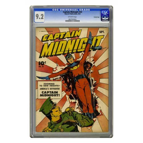 <B>Captain Midnight #24 Crowley Copy pedigree (Fawcett, 1944) CGC NM- 9.2 Off-white pages.</B></I> Smashing through the Rising Sun of the World War II Japanese flag comes Captain Midnight, star of radio, movies, television, and of course, comic books. This attractive pedigreed example is one of the two top-graded copies in the current CGC census report for this issue. Overstreet 2005 NM- 9.2 value = $585. CGC census 11/05: 1 in 9.2, 1 higher.