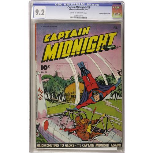 <B>Captain Midnight #28 Crowley Copy/File Copy (Fawcett, 1945) CGC NM- 9.2 Cream to off-white pages.</B></I> Bears a "Checking Copy" stamp on the cover. Overstreet 2006 NM- 9.2 value = $585. CGC census 11/06: 1 in 9.2, 1 higher.<BR><BR><b>Shipping:</b> Slabbed Comic (<a target="_blank" href="http://www.heritageauctions.com/common/shipping.php">view shipping information</a>)