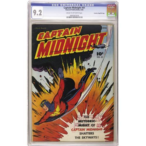 <B>Captain Midnight #41 Crowley Copy/File Copy (Fawcett, 1946) CGC NM- 9.2 Cream to off-white pages.</B></I> A great issue, only one copy of which has been graded higher by CGC. The lower right corner has a "checking copy" stamp. Overstreet 2006 NM- 9.2 value = $320. CGC census 11/06: 3 in 9.2, 1 higher.<BR><BR><b>Shipping:</b> Slabbed Comic (<a target="_blank" href="http://www.heritageauctions.com/common/shipping.php">view shipping information</a>)