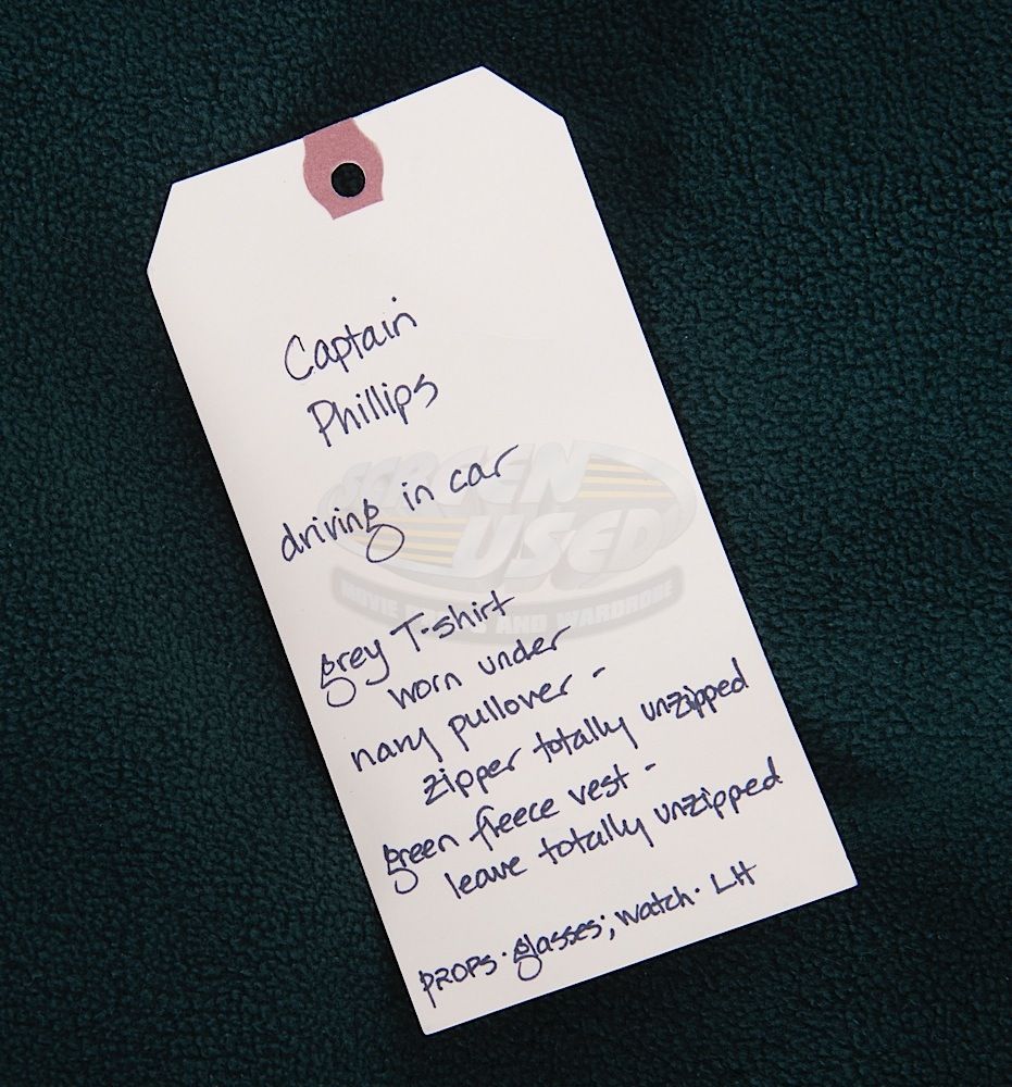 (Columbia Pictures, 2013) This outfit was acquired by the production for use by Tom Hanks as "Captain Richard Phillips". The outfit consists of a grey t-shirt, a navy blue pullover and a green fleece vest. Included with the outfit is a production used costume tag that details the outfit.