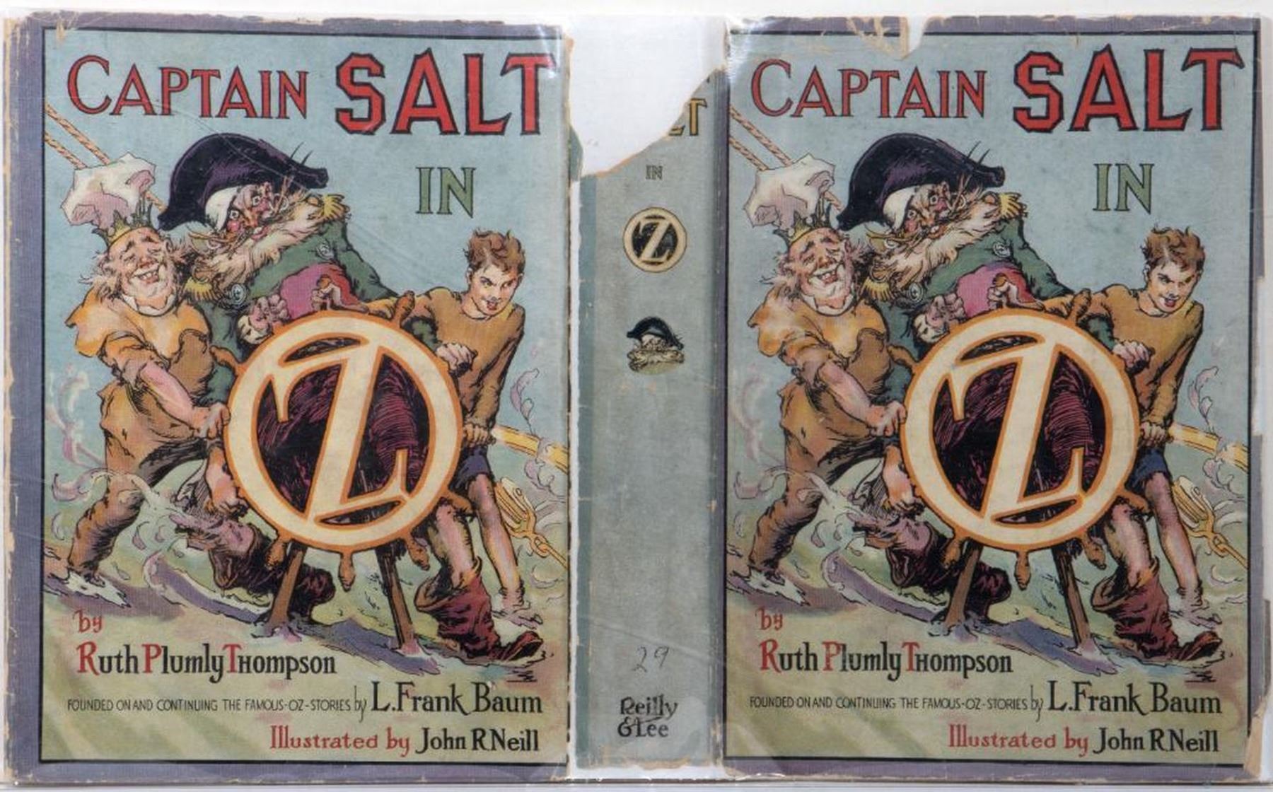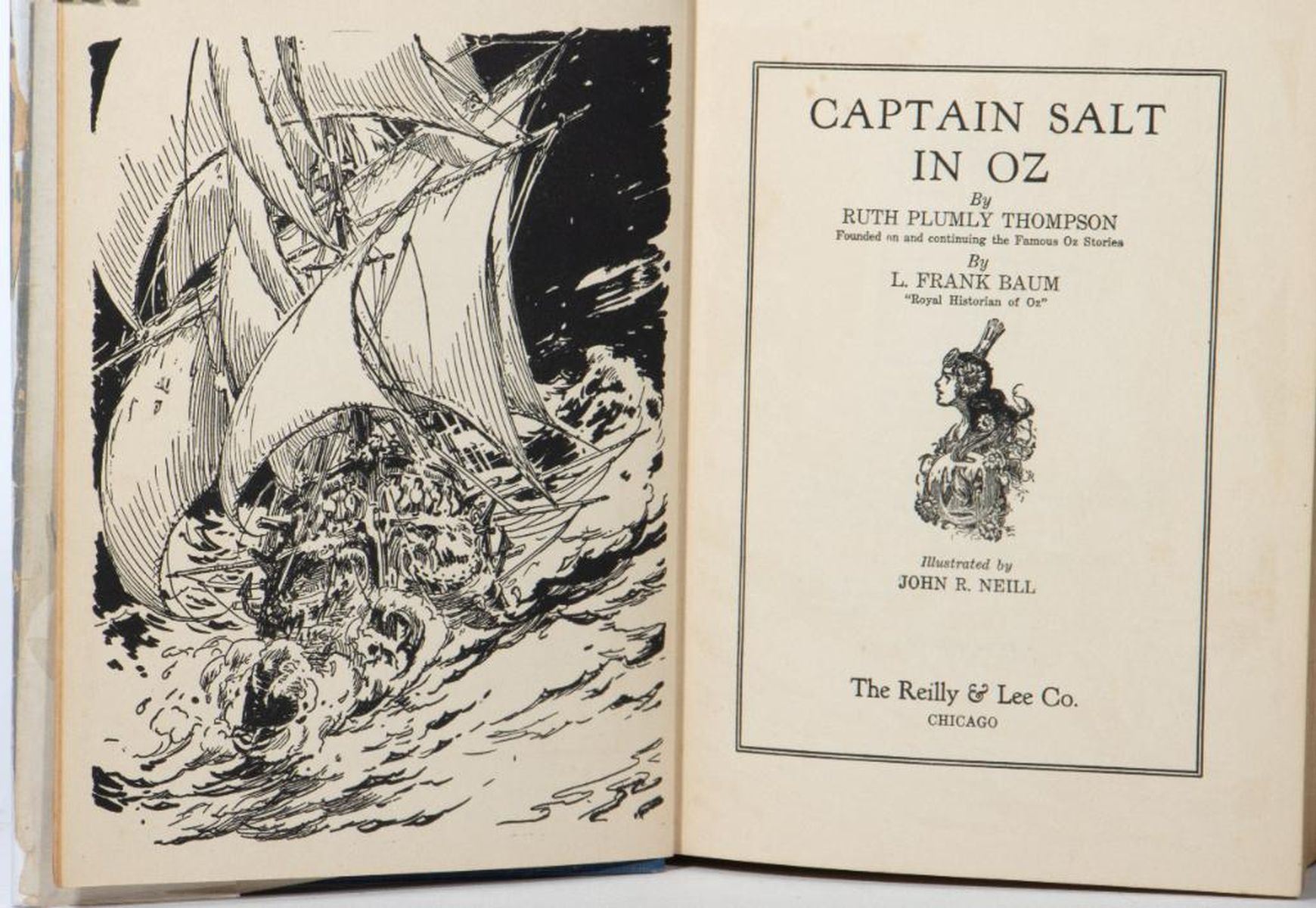 First Edition in Original First State Dust Jacket Captain Salt in Oz by Ruth Plumly Thompson, illustrated by John R. Neill. Reilly & Lee 1936 1 st edition, 1 st state in 1 st edition dust jacket with ads through Captain Salt on the back jacket flap. Illustrated throughout in black & white, illustrated endpapers, color pictorial label, original dark blue cloth, 16 page gatherings. This is the first Oz book published without color plates. Very good in good dust jacket. 29" inked on spine in black. Jacket has front flap detached but present.