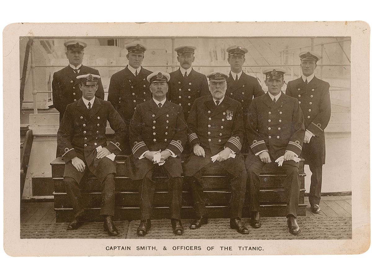 Unused ‘Signal Series’ real photo postcard of nine officers on the Titanic, captioned at the bottom: "Captain Smith, & Officers of the Titanic.” Reverse bears an ink signature. Light scattered creases, surface impressions, and soiling, otherwise fine condition. This photograph was taken on board the Titanic before it left Southampton on its maiden voyage; only four of the officers pictured would survive.