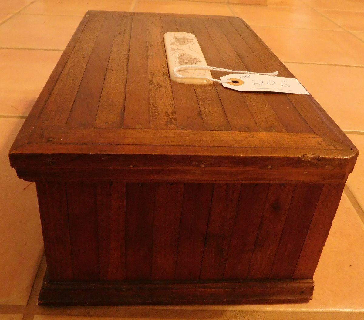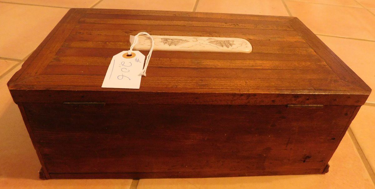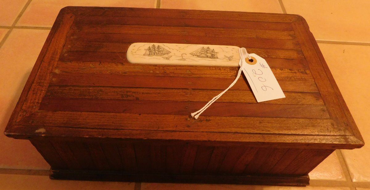 Captain's Scrimshaw Wood Chest, circa 1920s. Made of wood and bone, the item is 8.5" x 14.5" x 5.5". Nice little sea chest. Condition: Good, see images. Shipping: $32.50, due to size and weight, w/insurance and signature.