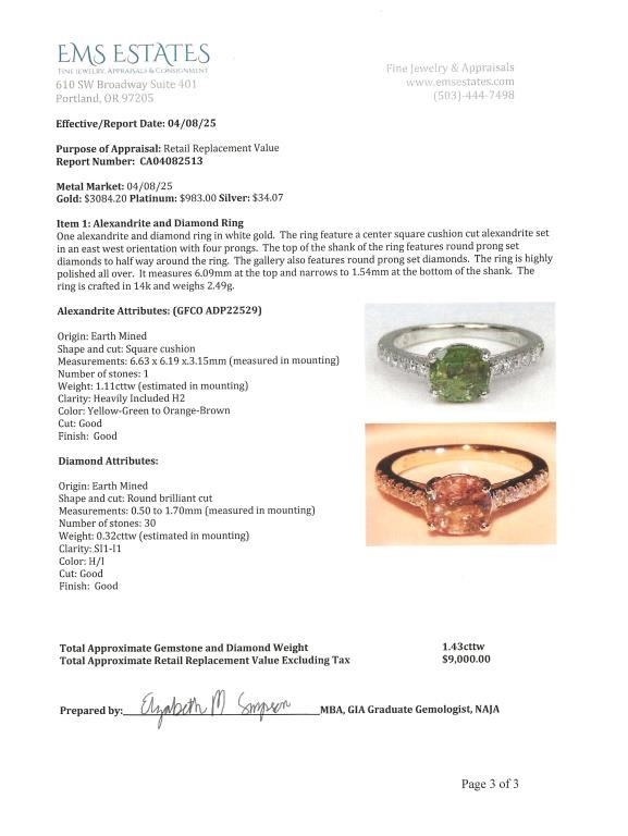featuring an oval cut Certified Natural Alexandrite weighing 1.11 carats with color change from green to orange-brown accented with 28 micro set Diamonds weighing approx. 0.32 carats with H-I colors and SI clarity set in 14 karat white gold setting, ring size 5. Full Retail Appraisal at $9,000.00