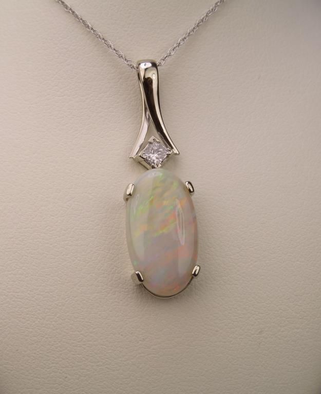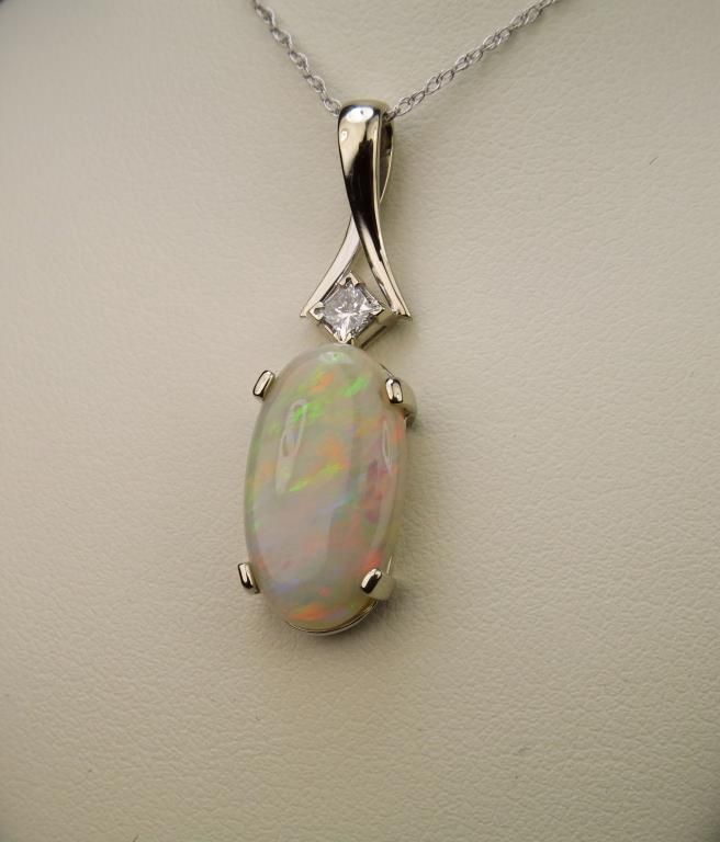 Captivating Opal and Diamond Pendant with gorgeous 4.50 carat Opal beautiful spectrum of color play accented with Princess cut Diamond weighing approx. 0.30 carats with G-H color and VS clarity set in 14 karat white gold with 18” white goldchain. Retail $1,800-$2,500 Estimate $1,000 -$1,500