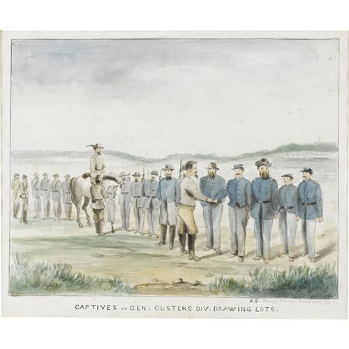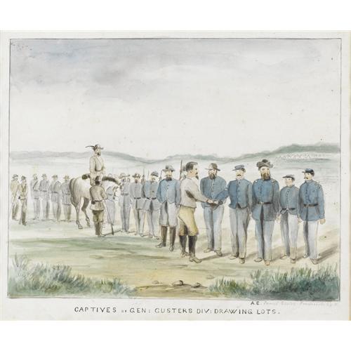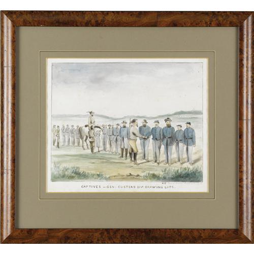 <B>General Custer's Cavalrymen Drawing Lots to be Executed by Mosby - A watercolor and pencil sketch of General Custer's Men Drawing Lots to be Executed - by Alfred Von Erickson</B></I> As Confederate Colonel John Singleton Mosby's raiders disrupted Union supply lines more and more in 1864, General Ulysses S. Grant reportedly told General Philip Sheridan that if any of Mosby's Rangers were captured, to line them up and execute them. That order was carried out by Brigadier General George Armstrong Custer's men and on September 22nd of that year Custer's troops executed seven of Mosby's men.<BR><BR> As this matted and framed 13 ½” x 11” drawing done in watercolor and pencil shows, Mosby swiftly retaliated. As he had captured seven Union troops of Custer's Division he ordered them executed. The Confederates proceeded to shoot, hang and do their best to exact revenge. Depicted here are seven of Custer's men drawing lots to determine who will be executed. Mosby sits at the left astride his horse as a Confederate passes a hat from which the unfortunates will draw their lot. This sketch of that historical event is titled <I>Captives of General Custer's Division Drawing Lots.</B></I><BR><BR>This drawing was done during the Civil War and is signed 'A. E.' with the notation 'Fredericks bg. V.'. The artist, Alfred Von Erickson lived in Fredericksburg, Virginia and painted scenes during the war. He moved to Canada in 1866 but this watercolor and pencil sketch and others survived. They were important enough to have been given to John S. Mosby and used as a template for woodcuts that were used to reproduce images in Mosby Ranger J. G. Beckham's book of 1866, <I>The Life of Mosby,</B></I> thus dating these to the war years.<BR><BR>This sketch is titled <I>Captives of General Custer's Division Drawing Lots.</B></I> It has some slight foxing but the colors are very vivid. It come is a nicely matted, walnut frame.<BR><BR><B>Provenance:</B></I> <I>John S. Mosby; The Tharpe Collection of American Military History</B></I><BR><BR><B>Exhibited:</B></I> <I>The Liberty Heritage Society Museum</B></I><BR><BR><b>Shipping:</b> Framed - with Glass, Medium (<a target="_blank" href="http://www.heritageauctions.com/common/shipping.php">view shipping information</a>)