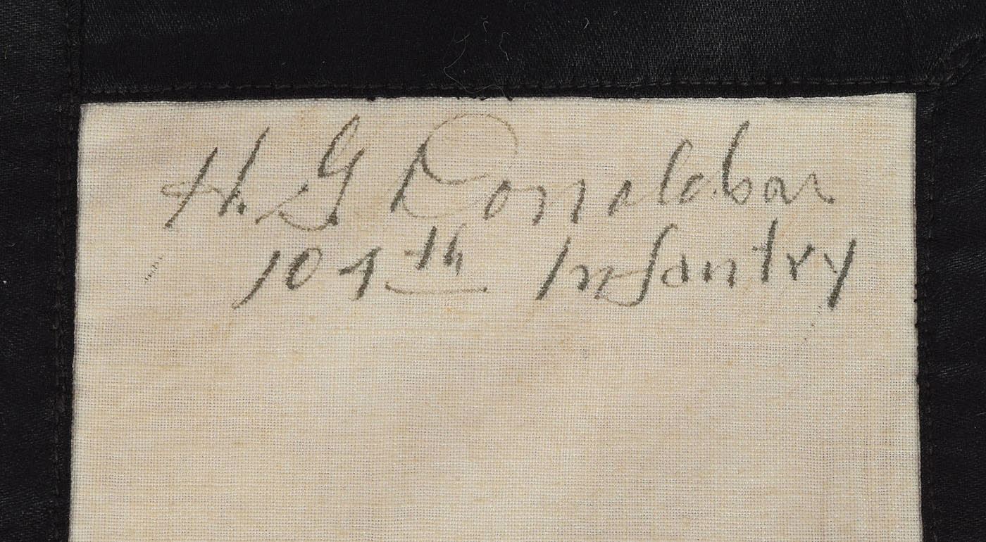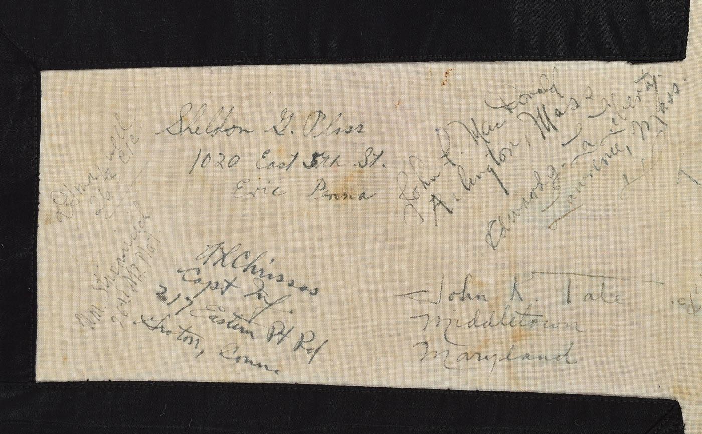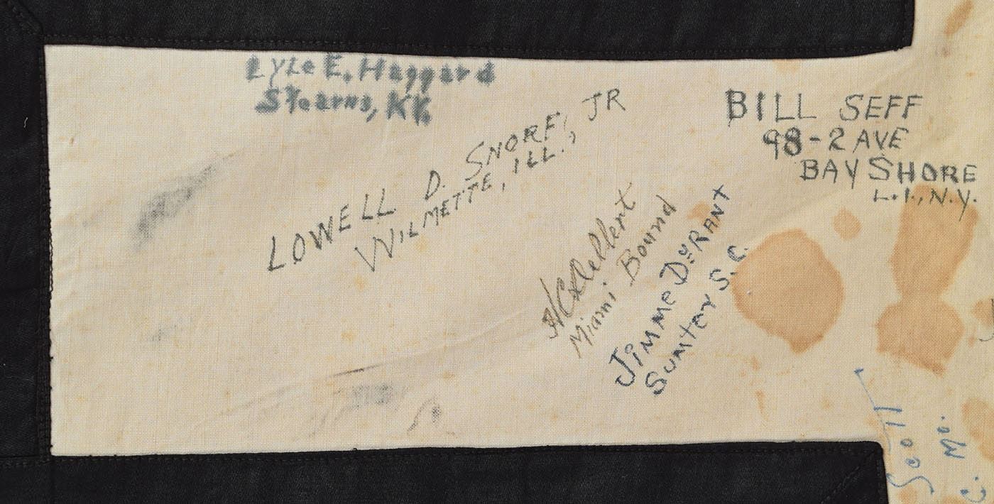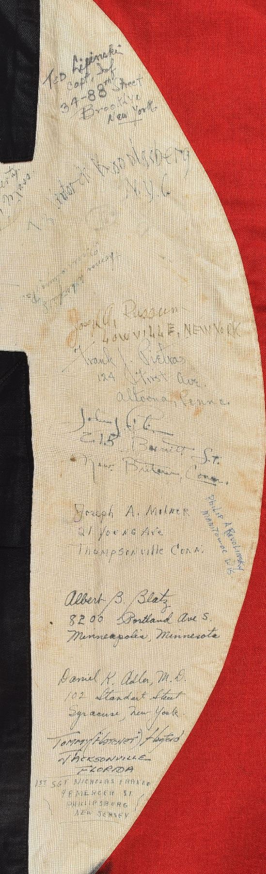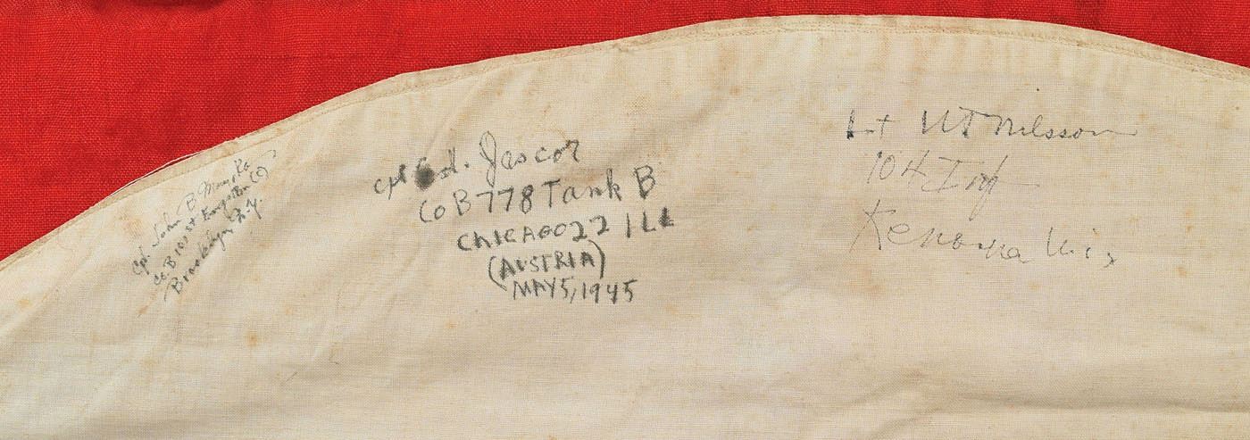 Large German Nazi flag captured by American forces during World War II, measuring 48 x 53, featuring a sewn-on black-on-white swastika against a bright red field, with additional sewn "Marktredwitz 4" patches on each side. The white area surrounding the swastika has been signed on both sides by over 70 American servicemen (the majority of them signing on one side), most adding their hometowns. The flag features seven aluminum rings sewn along the hoist, and silver bullion fringe along three edges. In very good to fine condition, with scattered staining. Allied forces took Marktredwitz—an important Bavarian railway hub—in April 1945, during the decisive final stages of World War II in Europe.