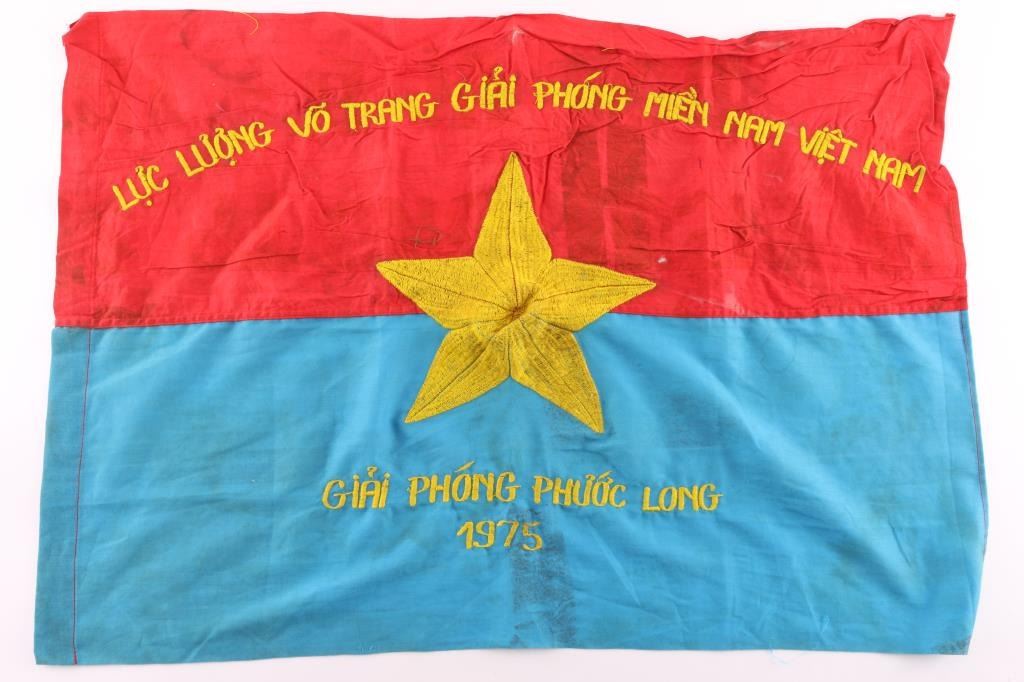 North Viet Cong/NVA Vietnam War National Liberation Front Battle Flag Giai Phong Phuoc Long 1975. Red and blue flag of the People’s Army of Vietnam with gold star and gold-embroidered lettering. Top line reads, "The Power of the Untamed Liberation of Southern Viet Nam.' The bottom line reads, "Free Phuoc Long 1975".The Battle of Phu?c Long was a decisive battle of the Vietnam War which began on 12 December 1974, and concluded on 6 January 1975. (ARVN vs NVA) Overall excellent condition, no rips or tears. a little staining. Measures 28 1/2" x 19".
