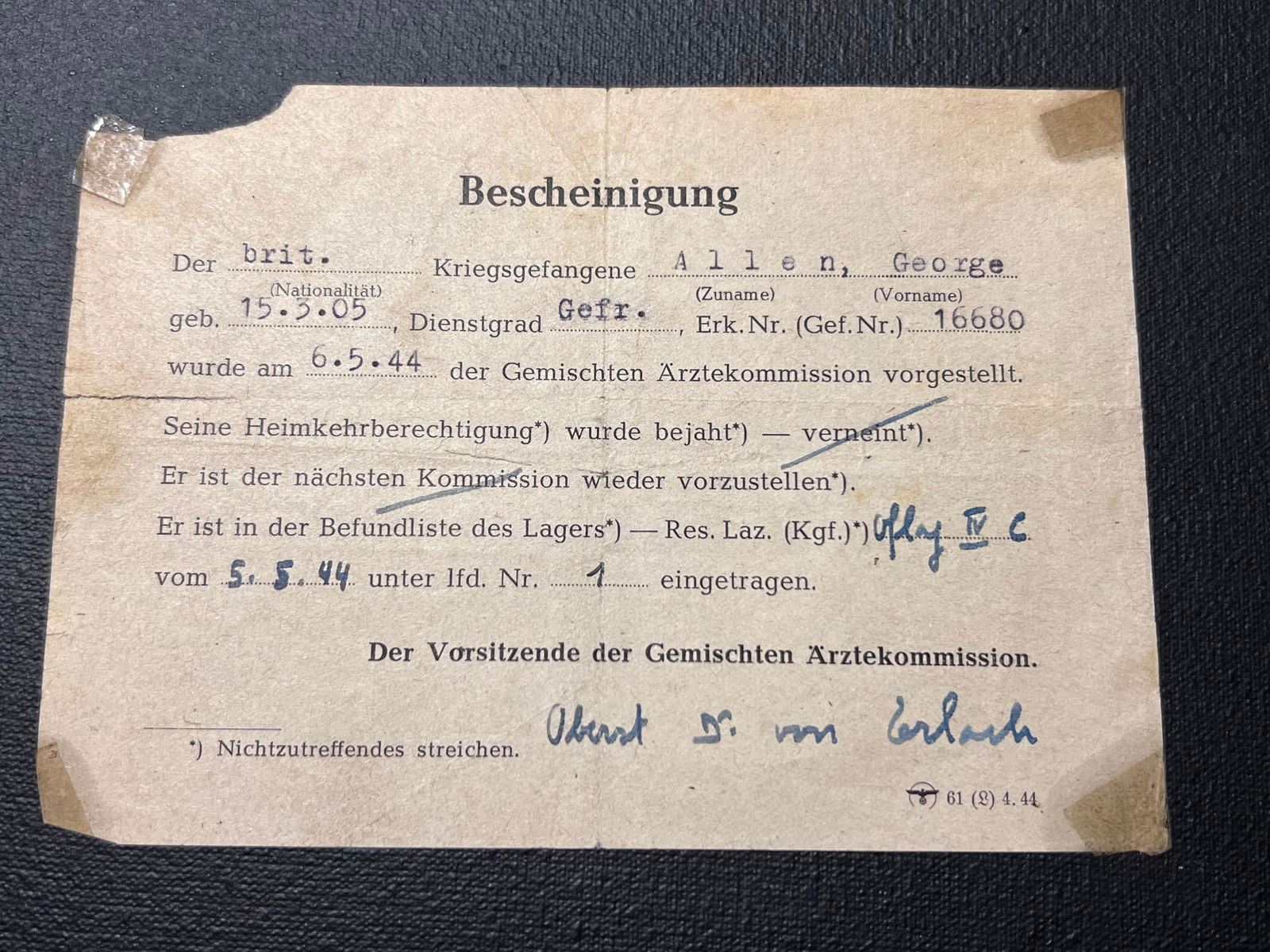 Captured at Dunkirk - Interned in Germany Most Secure Prison - Colditz - released by Swiss Col Dr von Erlach - Extremely Rare Grouping. Grouping Colditz Castle POW L\Cpl George Allen – Captured at Dunkirk – Swiss Dr Colonel von Erlach – Mutiny at Colditz 1944 – Geneva Convention Art 69 Repatriation. L\Cpl Allen was captured at Dunkirk on the fourth of June 1940. He was serving with the Royal Ulster Regiment, he was one of the unlucky ones left behind. But by 1943, Allen had already been in a few German POW camps. He had managed to end up being sent to the most secure of them all the infamous Sonderlager Colditz. Likely after escape attempts in other camps – Stalag XXA, Stalag XIIID (Nürnberg) and Oflag VI-C (Colditz). George Allen seems to be the only Royal Ulster Rifles soldier to have made it into Colditz! In May 1944, Allen was ill or injured and was considered by the Gestapo and OKW as not Deutschfeindlich thus fit for repatriation under the Geneva Convention. The Mixed Medical Commission (acting under the Geneva Convention) inspected Allen on their only visit to Colditz. The leading doctor of the MMC was the Swiss Colonel Dr von Erlach. He personally cleared Allen on that very special document in the picture in May 1944 at Colditz. The visit of the MMC delegation didn’t go down well, being described as a ‘Mutiny’ – that morning is described in-depth in the book by Major PR Reid, Colditz, the Full Story (See the story below). On the 11th of May 1944, Allen left Colditz as the first person to be recognised for repatriation under Art 69 of the Geneva Convention and later returned to Northern Ireland. The document hand signed at Colditz by Dr Col von Erlach (Swiss Army) is evidence of a very special victory over the Germans. The Swiss Dr von Erlach post war was famous for saving the children of those who carried out the failed attempt on Hitler’s life (Valkyrie: 20th July 1944) to Switzerland. The extract is from Colditz, The Full Story (Pan Military Classics Series) by P R Reid. ‘The German capitulation was complete and Allied solidarity, aided by the Swiss Commission outside, had won a memorable victory. The Germans’ arrogance of 1941 and 1942 was changing and, from this day in May 1944 onwards, the prisoners in Colditz began to feel solid ground once more beneath their feet. The episode was an important turning point. The prisoners knew that Hitler and his minions intended to use them as hostages in the hour of defeat. Here was a gleam of hope...’ Colditz, The Full Story (Pan Military Classics Series) – P R Reid, p.261 POW File from German Archive is also available as a copy to the winner of this auction.