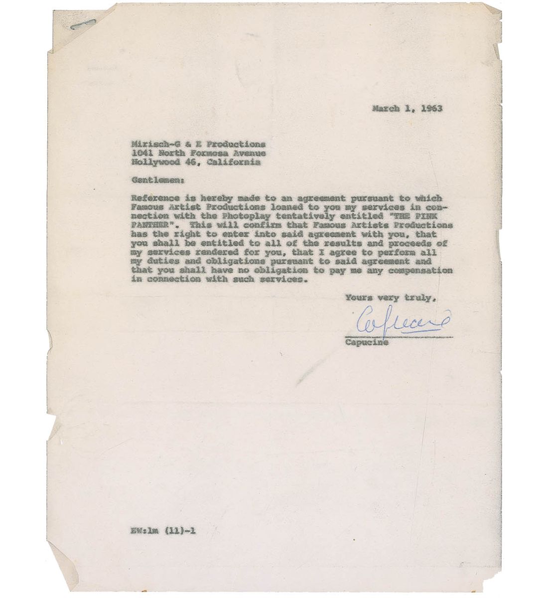 Actress (1928–1990) who committed suicide by leaping from a window. DS, one onionskin page, 8.5 x 11, March 1, 1963. Capucine confirms that Famous Artist Productions has the right to loan her services to Mirisch-G & E Productions “in connection with the Photoplay tentatively entitled ‘The Pink Panther.’” In very good condition, with scattered creases, dings and small tears to the borders, and a staple to the upper left corner.