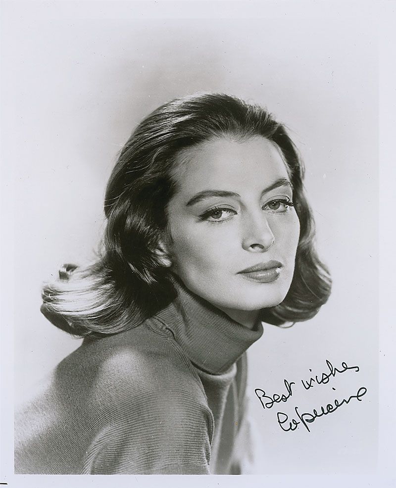 Lovely glossy 8 x 10 head-and-shoulders portrait of the French actress, signed in black felt tip, “Best wishes, Capucine.” In fine condition.