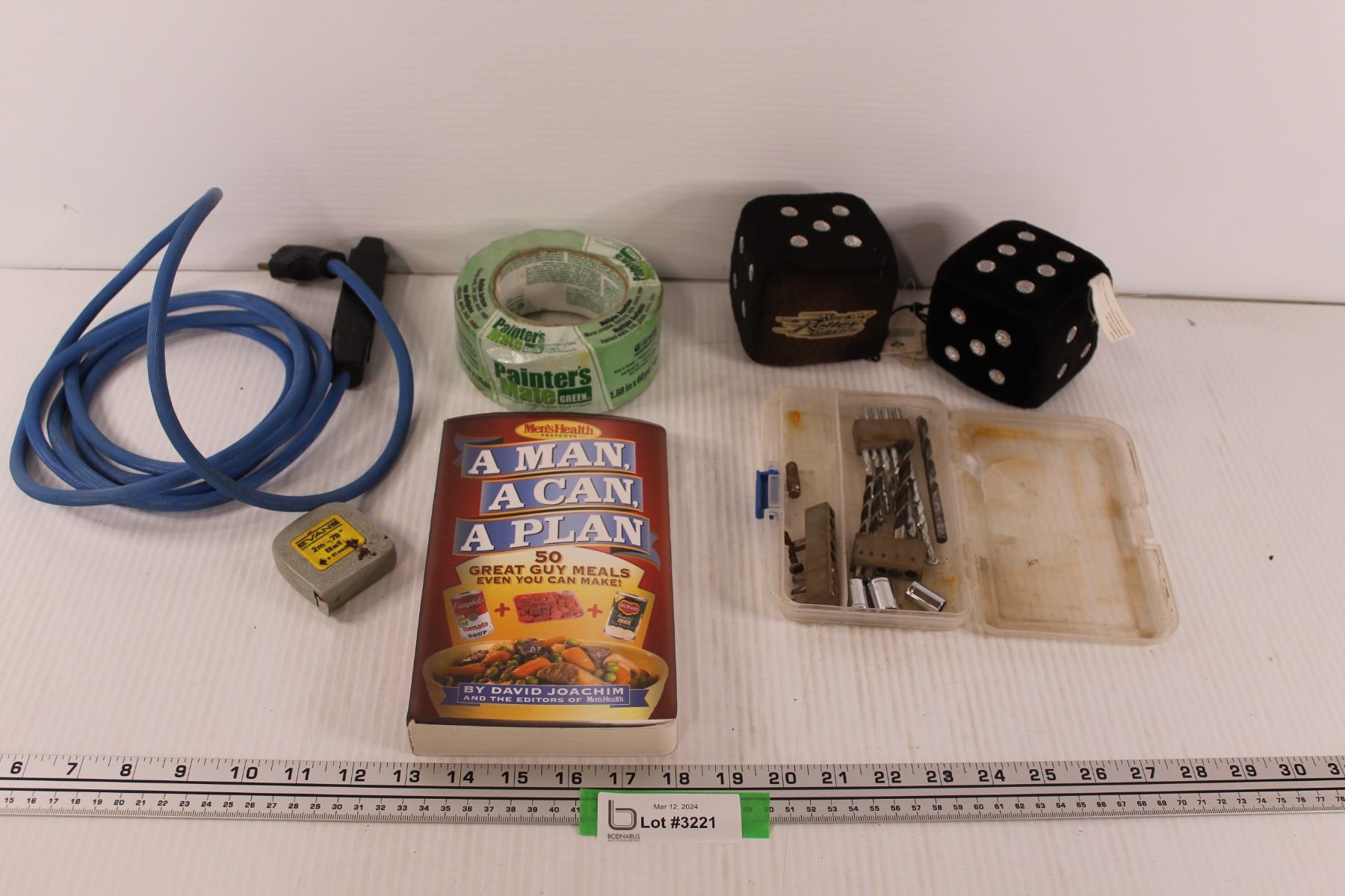 Car Dice, Extension Cord, Drill Bits, Measuring Tape, Men's Cookbook, Misc.