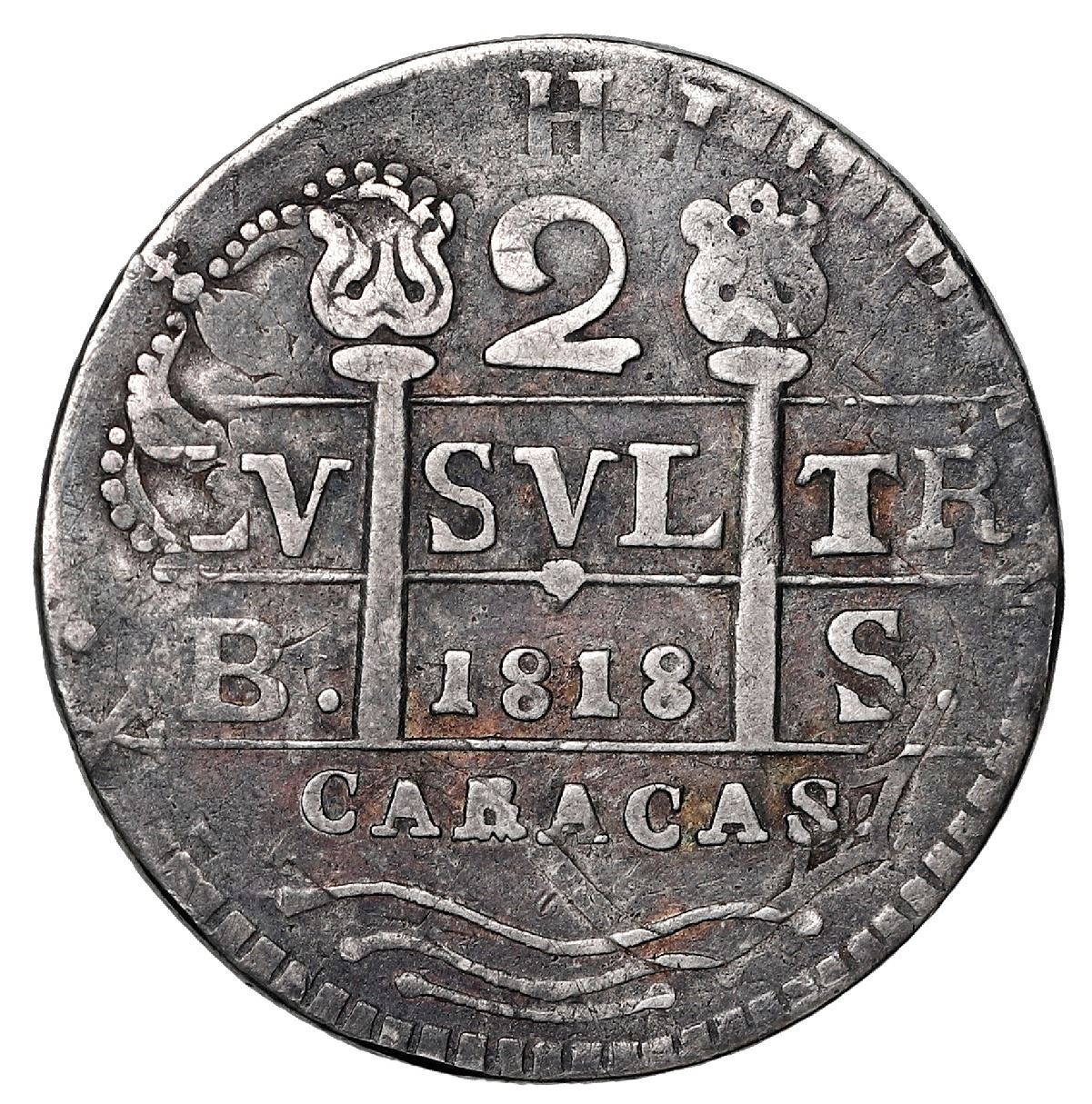 Caracas, Venezuela, 2 reales,  1818  date (1R-sized digits, struck 1830) BS, florettes flanking cros