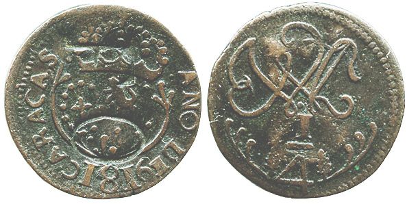 Caracas, Venezuela, copper 1/4 real, 1816, large date, with unidentified countermark "F O" in large letters. KM-C2; CT-1508. 4.9 grams. Dark VF with slightly porous surfaces, the countermark bold but unattributable.