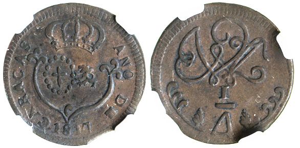 Caracas, Venezuela, copper 1/4 real, 1817, small date, encapsulated NGC XF 40.