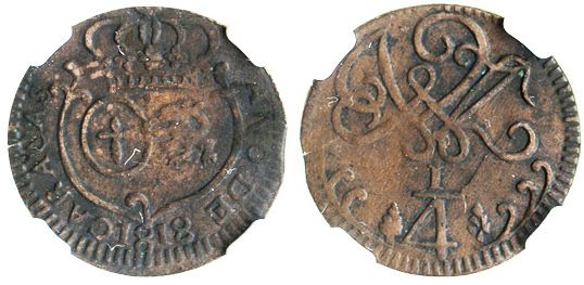 Caracas, Venezuela, copper 1/4 real, 1818, small date, encapsulated NGC XF 40 BN. KM-C2; CT-1510. Low contrast (some light color) and slightly weak strike, but prominent striking lines on fields, much of rims off the flan. Note: KM values for the 1817 and 1818 in this series are way too low and do not accurately reflect the current market.