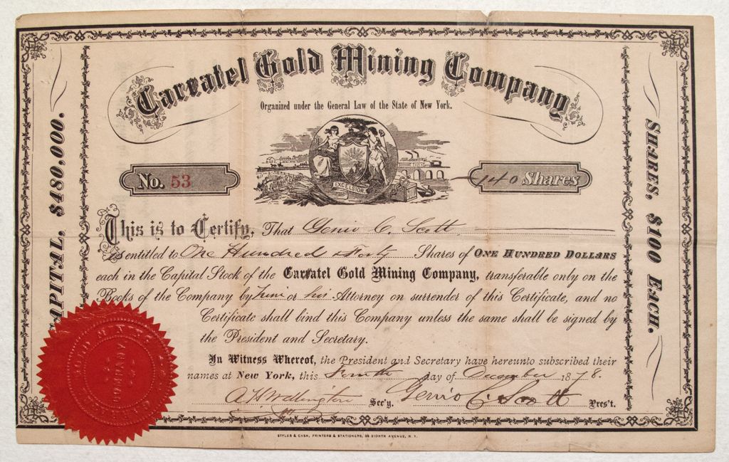 Cert. # 53 for 140 shares issued to Genio C Scott. Signed by A H Wellington & Genio C Scott. Small teas along top at the folds, Red corporate seal. Caratel originally printed with two R's but one r marked out.