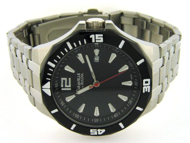 This is a Caravelle by Bulova Men's 45B110 Black Dial Stainless Steel Watch with the following features: all-black bezel and matching dial; luminescent silver-tone stick hour markers; dodecagon-shaped bezel is with thick hour-and-minute markers; date window at three o'clock; stainless steel bezel, case, and band; fold-over-clasp with a double-push-button safety; Japanese-quartz movement; Mineral crystal dial window protection; Water resistance to 99 feet (30 M); 41 millimeters Case diameter; 12.4 millimeters Case diameter; and 24 millimeters Band width.
